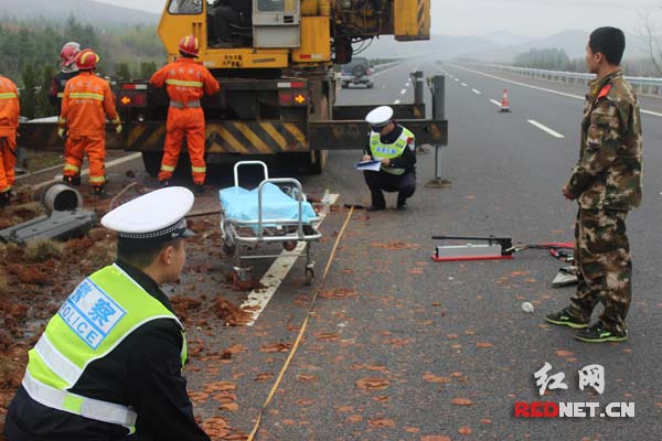当日凌晨5:40,流峰警务站接桂武北中队转警称:在岳临高速南往北方向458KM处有一辆重型半挂车与中央隔离带相撞并发生侧翻,驾驶员被卡在车下,情况十分危急。流峰警务站站长李振华带领民警喻振兴、段若海立即赶赴事故现场,并通知值班民警立刻联系消防、急救等部门赶往事故现场。民警到达事发地后,发现牵引车停在南往北方向超车道,而重型半挂车已经撞开中央隔离带侧翻于另一侧的超车道,满车的树皮已翻于车外,更令人担心的是,牵引车驾驶室被压在半挂车下,司机卡在被挤压变形的驾驶室内不能动弹,情况十分危险。民警见状立即展开现场处置工作。一是联合施救队南北双向示警,提示后方来车减速行驶,以防发生二次事故;二是进行事故现场勘查、维护现场秩序,并配合消防抢救伤员;三是控制好现场,做好当事人工作;四是配合路政做好事故现场的清理和货物转运。