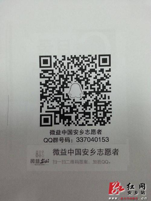 如果您有意向参与微益中国志愿者,那就请扫描下面二维码“微信中国安乡志愿者”或者加入QQ群337040153(微益中国安乡志愿者),让大家共同汇聚爱心,共同参与公益,共享face to face的感动。