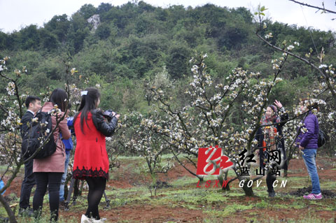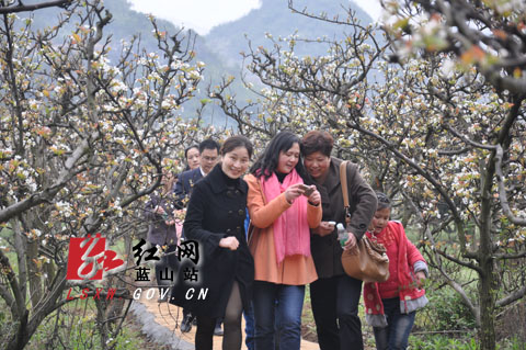 (游客在蓝山县大洞梨园游玩)