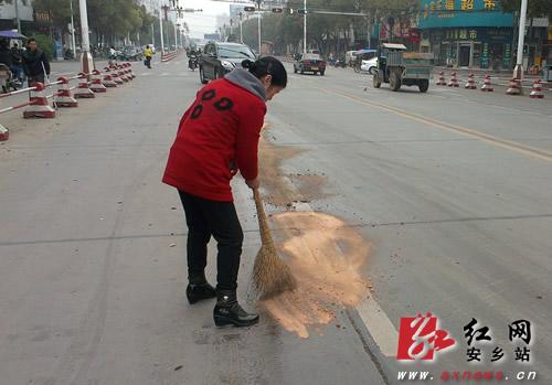 记者立即与环卫等有关部门取得联系,15分钟后,有关部门来到现场,处理洒落在地的机油。