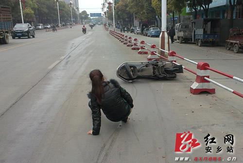 一位女士的摩托车被甩出几米开外