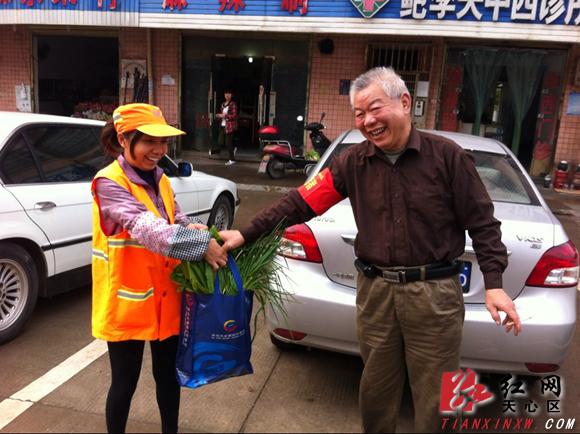 红网天心站3月31日讯(通讯员 邹进)“这是我从地里刚摘的蔬菜,给你拿一点来,很新鲜咧!”3月31日,一清早,夕阳红邻里守望志愿者张志明就将一大袋新鲜蔬菜送给了社区环卫工肖淑莲。