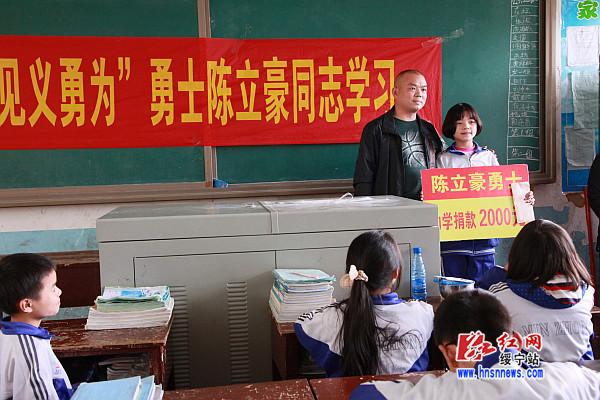 红网绥宁站4月2日讯(通讯员 龙宪智)“见义勇为是中华民族的优秀传统美德,也是一个人具有正义感的具体表现。我虽然生活不算富裕,但这份奖金有着它特殊的含义,我将它捐助给更需要帮助的贫困孩子,让这笔奖金更有使用价值。”4月1日下午,见义勇为先进分子陈立豪把他获得的部分奖金捐助给绥宁县民族中学207班贫困学生袁娟娟,帮助她上学读书和改善生活。