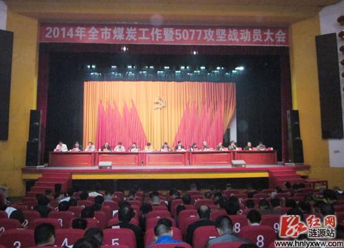 红网涟源站4月12日讯(分站记者 童 燕 通讯员 苏文胜)4月11日,涟源市煤炭工作暨“5077”攻坚战动员大会在市湘剧院召开。省煤矿安全监察局副局长、“5077”攻坚战娄底包片督导组组长丁国强莅临指导,涟源市领导曾益民、谢学龙、宋建明、梅国华、贺顺清、吕余庚、朱桂良、倪志铭、肖更新、梁小兵、傅德贤、邱超文、梁毅出席会议。涟源市委书记曾益民作重要讲话,市委副书记、市长谢学龙作动员报告,市委常委、政法委书记梁小兵主持会议。