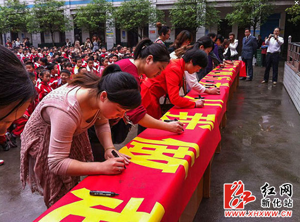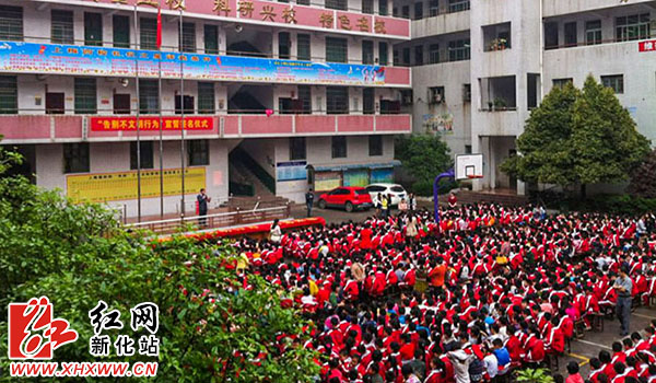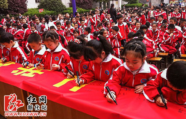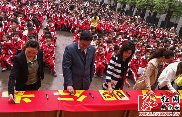 红网新化站4月12讯(分站特约记者 邱向明 通讯员 刘扬 黄长松 邹联芳)4月11日上午,新化县上梅镇第四小学2700余名师生,在校园里开展“告别不文明行为宣誓签名仪式”活动。
