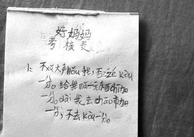 网友@ meilin34家住长沙市岳麓区,女儿诗怡今年6岁了。4月9日早上出门前,她突然发现茶几上放着女儿的小本子,上面用铅笔歪歪斜斜地写着“好妈妈考核表”。并列出了“吼我扣一分,给我买好吃的加一分;每天带我去超市加一分,否则扣一分。”有几个不会写的字,还用上了拼音。