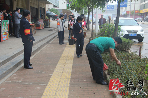 宜章县八中学生邓科薇向全县人民发出了文明劝导活动的倡议书:要在全县广泛开展“告别陋习、从我做起”文明劝导活动,要争做学习文明的有心人,传播文明的热心人,践行文明的劝导员,以我们的言行共同打造省级文明县城的精美名片。启动仪式结束后,文明劝导员佩戴“文明劝导员”袖章,拿着钳子和垃圾桶捡花池和路边的垃圾,并劝导门面店主不要把东西摆到外面,要做到门前“三包”。