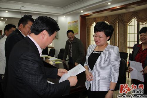 涟源市委副书记、市长谢学龙(右)向罗家佃社区党总支书记递交在职党员社区报到情况登记表。