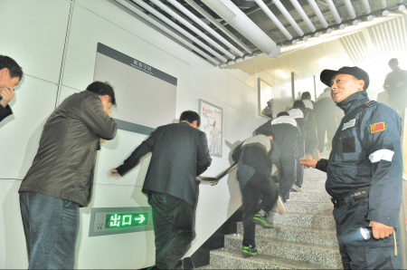 地铁站出口,在蓝天救援队队员和志愿者们的疏导下,乘客们用手或者毛巾掩着鼻子,冒着“浓烟”,迅速而有序地撤离火灾现场。 陈飞 摄