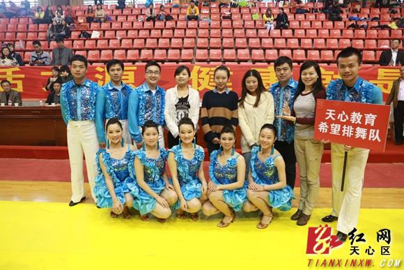 红网天心站4月24日讯(通讯员 徐拓)4月23日,长沙市天心区2014年“欢庆五·一,舞动南城”职工全健排舞大赛在长沙市明德中学体育馆举行,长沙市总工会党组副书记、副主席匡涛涛、女职工部部长张孟、天心区委副书记邓鹏宇、区人大副主任汤楚罗、区政府副区长刘晓蓉、区政协副主席杨培春、区总工会党组书记、主席肖时昴、区文体新局局长雷利娜等市区领导亲临现场观看比赛,并为获奖队伍颁奖。