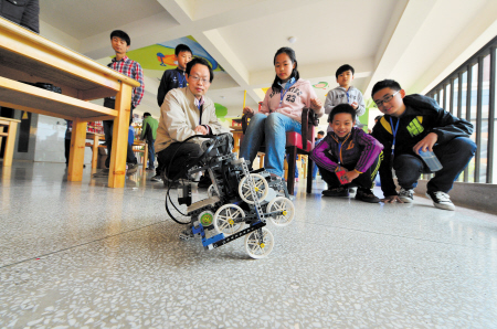 能灵活转动自如爬楼梯,孩子们发明的“行星轮式自平衡爬楼梯机器人”表现了他们对残疾人和老年人的关爱之情。 陈飞 摄
