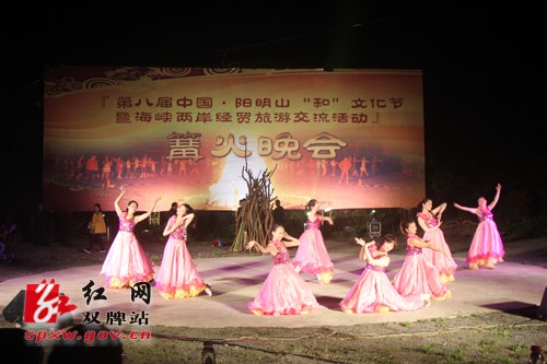 晚八时,篝火晚会在阳明山红杜鹃艺术团动感开场舞蹈《阳明山》拉开序幕,情景剧《大话西游》和花鼓戏《梅兰芳》将结合地方特色文化介绍给了来自远方的客人,原创歌曲《双牌我的家》、《带你去看杜鹃花》等,以优美的歌声让现场的观众更全面的认识和了解阳明山,悠扬美妙的旋律让观众们仿佛置身于杜鹃花的海洋。晚会博得了现场嘉宾和观众的阵阵喝彩,让来自台湾的同胞们感受到了祖国内地同胞们的热情和独特的地域文化特色。