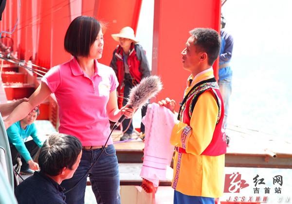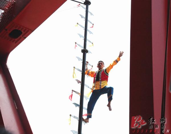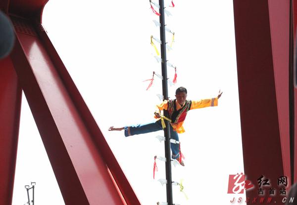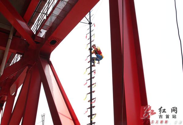12米高的刀梯,伸出矮寨大桥3米之外,完全悬立在350米高空。龙光青拿毛巾擦了擦汗水,转了转手腕,舒了口气,大喊一声“加油”,他在矮寨大桥上的大挑战正式开始。只见他不带任何保护,不穿鞋子,赤手空拳,毫不犹豫登上了锋利的刀梯。