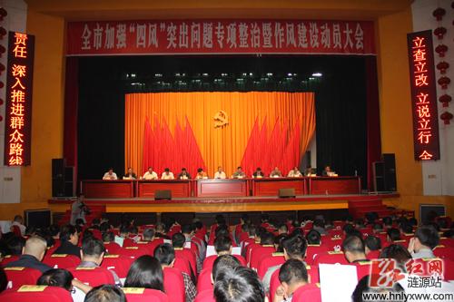 红网涟源站5月9日讯(分站记者 蒋葵) 5月8日,涟源市加强“四风”突出问题专项整治暨作风建设动员大会在市湘剧院召开。娄底市委驻涟源督导组常务副组长谭应林到会指导,涟源市委书记曾益民传达学习了习近平总书记和刘云山同志关于党的群众路线教育实践活动的重要讲话精神,就全市加强“四风”突出问题专项整治及作风建设作全面部署,要求以“准”的方向、“狠”的力量、“韧”的坚持抓好突出问题的整改落实,做到整改不到位不放过,群众不满意不销号。
