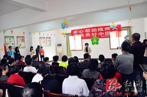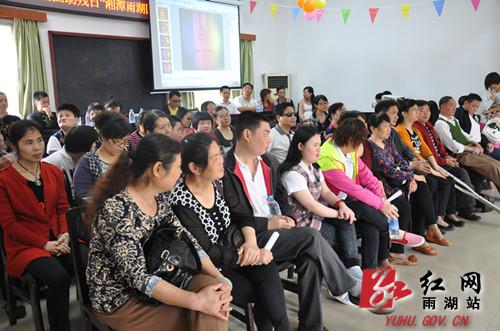 红网雨湖站5月12日讯(分站记者 陈娟)每年5月第3个星期日为全国助残日。为庆祝第24个“全国助残日”的到来,5月10日,湘潭市雨湖区残联在江麓医院大会议室举行残疾人文艺汇演,旨在给残疾人带来更多的欢乐。大家欢聚一堂,庆祝这个美好的节日。湘潭市残联理事长王艳霞、雨湖区联负责人现场观看了汇演。残疾人是此次文艺汇演舞台的主角。肢体残疾人刘惠现场做的玫瑰花,漂亮鲜艳;阳光家园表演集体舞《动感兔子舞》,节奏欢快;阳光家园残疾朋友与湘大志愿者一起演绎的集体舞《感恩的心》,感人至深;视力残疾人演奏的笛子《红梅赞》,让人耳目一新;大合唱《难忘今宵》,让人回味无穷……