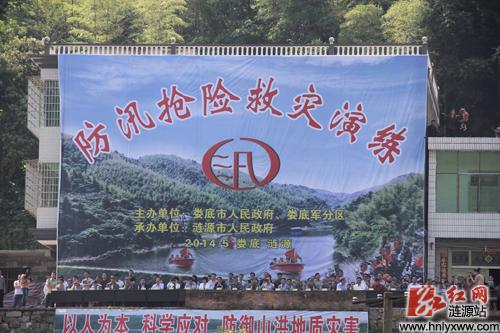 红网涟源站5月14日讯(分站记者 吴一夫 通讯员 肖莺 伍建飞)为全面落实省市防汛会议精神,扎实开展党的群众路线教育实践活动,提高防汛应急处置能力,增强干群防灾避灾意识。5月12日,由娄底市人民政府、娄底军分区主办,涟源市政府承办的2014年娄底市防汛抢险救灾演练在石马山镇杨岭村举行。娄底市委常委、市委秘书长王雄,市委常委、军分区司令员欧友生,副市长、市防指指挥长刘益丈,娄底军分区参谋长周仁友及涟源市领导曾益民、谢学龙、谢永东、段德学、刘志然、邓文旦和娄底各县市区有关负责人观摩了演练。