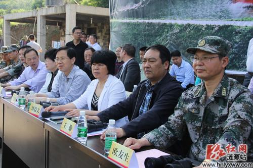 娄底市委常委、市委秘书长王雄(前排右二),市委常委、军分区司令员欧友生(前排右一),副市长、市防指指挥长刘益丈(前排右三),涟源市委书记曾益民(前排右四),市委副书记、市长谢学龙(前排右五),市委常委、市委办主任谢永东(前排右六)等领导观摩演练。