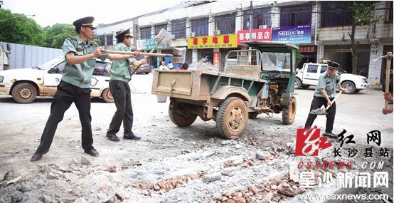 红网长沙县站5月15日讯(星沙时报记者 熊文 实习生 崔月龙 通讯员 黄新辉)“之前杂乱的局面没想到这么快就解决了!”看到新街面貌焕然一新,家住长沙县春华镇农贸市场旁的王娭毑喜悦之情溢于言表。以前该镇农贸市场周边私搭棚现象严重,有些商户占道经营,鞋摊、榨油摊挡路,周围居民将其称之为“邋遢路”。5月13日,春华镇政府联合城管、交警等多个部门组成近百人的执法队伍对集镇进行集中整治,“邋遢街”变身“清爽路”。上午10时许,在春华镇新街,执法人员正对一店面外堆放的建筑垃圾进行清理。在这个不足20平方米的空地上,之前居然存放了20吨水泥、40件瓷砖,另有100多根PVC管。县城管执法大队长龙中队队长黄荣福表示,行动开始后已责令店主将其运走,对于不能搬离的建筑垃圾,由执法人员进行清理,并装上拖车运走。当天的整治行动过程中出动了大型吊车、气焊、氧割等设备,共拆除违规经营摊点25个,违章广告招牌10块,违章建筑20户。