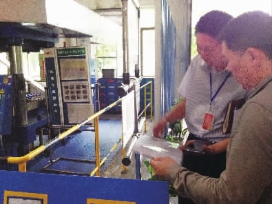 安监部门工作人员在“时代新材”弹性元件生产车间检查企业安全隐患排查治理记录。李伟锋 摄