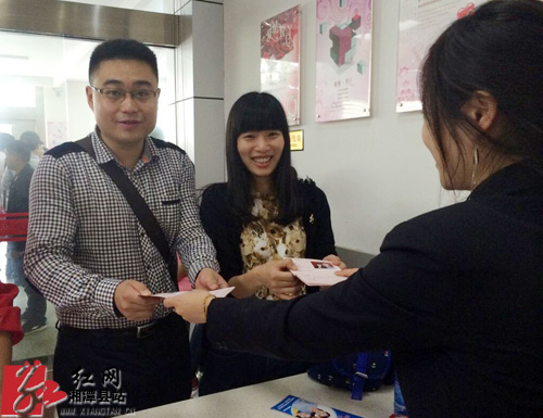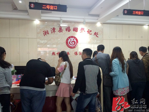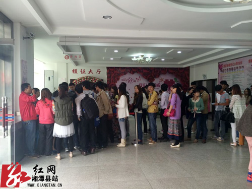 红网湘潭县站5月20日讯(分站记者 罗建 通讯员 唐慧超)“520”因谐音“我爱你”,而受到广大新人尤其是80后的追捧。今天,5月20日,湘潭县民政局婚姻登记大厅里人山人海,一对对新人喜滋滋地拿出手机自拍展示着他们好不容易拿到的结婚证。520,我爱你,美好的寓意让不少新人选择在今天步入殿堂。这一切,都让今天变得“有爱”起来了。“我们结婚啦!”刚刚拿到“红本本”的周思和邓露发出这样的感叹。周思和邓露是2014年5月20日第一对在县民政局婚姻登记处办理结婚登记的新人,两人是地道的莲乡伢子、莲乡妹子。“我们早就商量好了,第一个是特意选在今天这个特殊的日子,第二个就是要做今天第一对领证的新人,哈哈哈,给力吧。”周思和邓露两人相识相知多年,为了办结婚证,二人特意请假并早早来到登记处,相约一定要做“520”的第一对幸福新人。