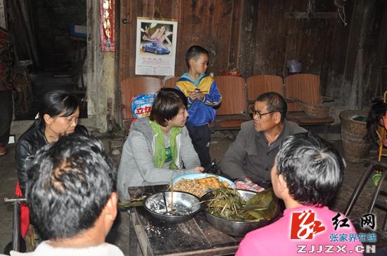 图为芭茅溪乡群众给央视记者介绍粽叶等级