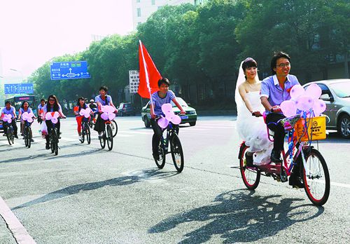时刻新闻 —分享— 5月27日,吉首市乾州新区,吉首青年向晶用单车迎娶新娘苏玉红。别出心裁且环保俭朴的迎亲单车队伍吸引了不少路人的眼球,被向晶家乡街坊邻里传为佳话。陈绪新 摄 来源:湖南日报 编辑:王娉娉