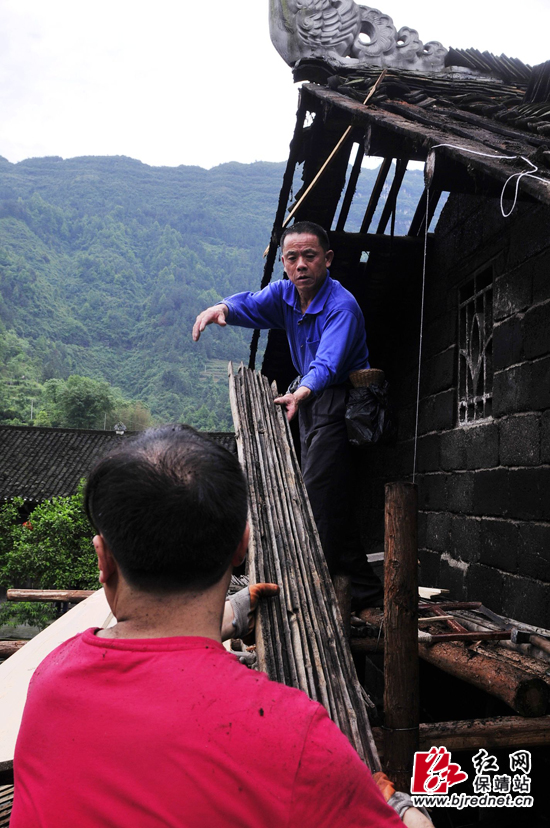 夯沙村特色民居保护工程启动,首栋破旧居民房顶被拆除 彭司进 摄