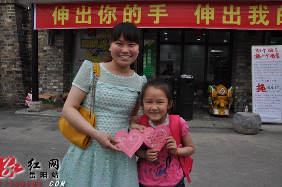 红网岳阳站5月30日讯(分站记者 宁平)5月29日,共青团临湘市委、湖南省十三村食品有限公司联合举办了主题为“大手拉小手爱心伴成长”的公益活动,50名志愿者与50名留守儿童结成了对子,现场有十三村公司、新文书店等6家单位捐助钱物上万元。3年来,该公益活动已吸引730多名志愿者参与,累计为留守儿童捐助钱物20余万元。当天,在十三村公司开展了丰富多彩的活动,志愿者一一给结对的孩子送上了祝福卡片。今年8岁的王雨馨在临湘市忠防镇新田村读三年级,与她结对的志愿者李水晴是忠防镇的团委书记。李水晴早在2012年就与王雨馨结成了对子,在学习和生活上对她进行鼓励和帮助。在卡片上,李水晴写道“祝愿王雨馨同学健康成长,好好学习,天天向上!”