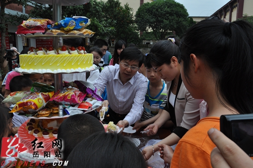 图为临湘市委副书记李伍华(左一)为孩子们切蛋糕。