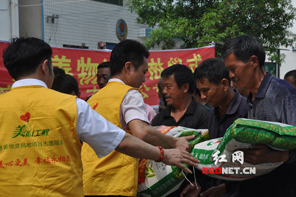 (捐助方和志愿者为受灾村民发放物资)