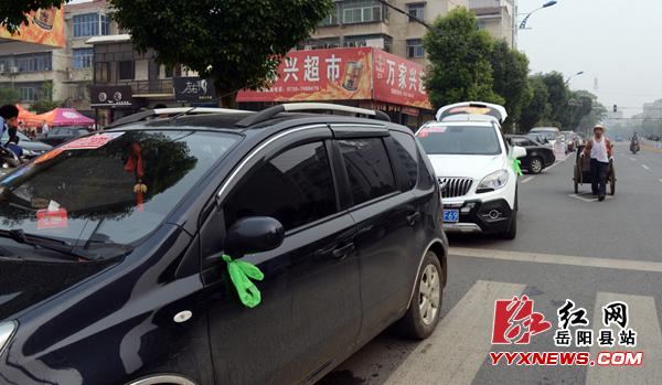 一对绿丝带,代表免费志愿送考车,高考路上,招手即停。系有绿丝带或贴有“爱心送考”的车辆载着考生,行驶在县城街头巷尾,汇聚成了一道靓丽的风景。