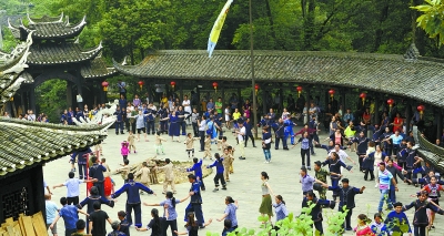 时刻新闻 —分享— 6月7日,永顺县双凤村,村民和游客齐跳摆手舞。当日,该县灵溪镇老司城村与有“土家第一村”之称的大坝乡双凤村,联合开展跳茅古斯舞、吹木叶等民族文化表演。 向水生 摄 来源:湖南日报 编辑:王娉娉