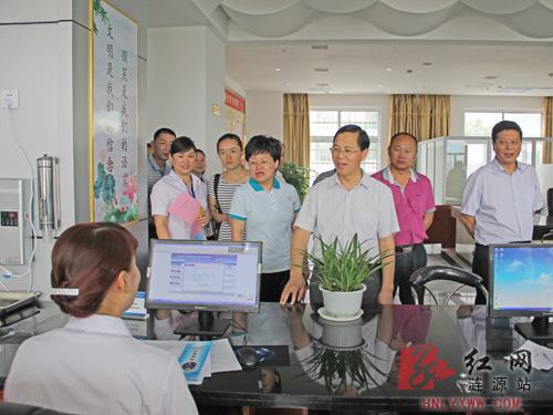 涟源市委书记曾益民(右三),市委副书记、市长谢学龙(右四),市人大常委会主任梅国华(右一),市政协主席贺顺清(右二)在市政务中心新增设的服务办事大厅调研指导工作。(黄超 摄)