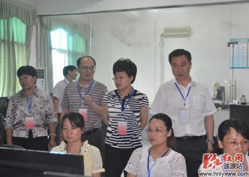 涟源市委副书记、市长谢学龙(后排右二),市委副书记宋建明(后排右一),市委常委、组织部长、统战部长朱桂良(后排右三),市人大常委会副主任童春秀(后排左一)在市一中考点电子监控室查看考场考务工作。