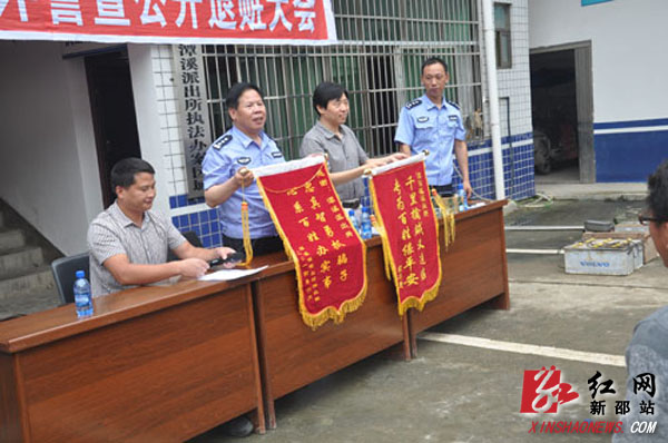 6月11日上午9时,新邵县潭溪镇在该镇派出所举行了开门评警暨公开退赃大会。会上集中展示了前段公安机关严厉打击侵财性犯罪行动取得的成果。新邵县公安局副政委陈国祥、潭溪镇党委书记孙爱华出席大会,派出所民警、失主代表、村(居)民代表、群众代表共50余人参加了大会。广大村民群众、来往过路群众纷纷驻足,观看了大会集中退赃的热烈场面。