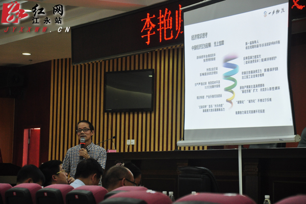 首先,李艳归以《研究发展规律共创企业长青》为题,为全体学习的成员上了一堂生动、有趣的辅导课。报告通过研究近代以来世界主要经济体的经济发展规律,对中国与美国、日本等主要经济体进行全面系统的比较研究,并结合当前中国的产业发展实践,对中国的经济发展进行了趋势分析,并就未来物流行业发展的美好前景进行了展望。报告立意深远、内容丰富、生动幽默、理论与实践相结合,具有很强的指导性和操作性,对我们统一思想、凝聚力量、加快江永非公经济发展,谱写中国梦江永篇章,具有重要的现实指导意义。