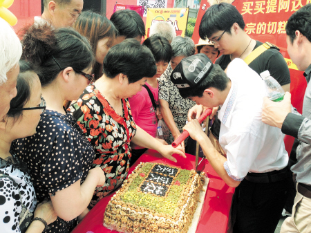 本报讯(记者 陈焕明)昨日在河西步步高广场一角,人头攒动,好不热闹,原来是最近因为“切糕”而火到爆的长沙理工大学3名90后大学生,阿迪力·买买提吐热、蒋春杨、蒋金亚现场将重达30斤的大切糕切好免费送给市民品尝。除了切糕免费吃,“切糕小王子”三名合伙人还与步步高商城签订合同,成为首个入驻的步步高商城全国特色食品平台商家,让消费者可以买到正宗的买买提·阿达西切糕。