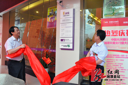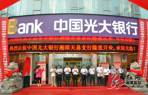 红网湘潭县站6月17日讯(分站记者 龙显扬)湘潭县金融支撑企业发展又添生力军!17日,中国光大银行正式进驻湘潭县,位于县城白石广场正对面的光大银行湘潭天易支行于当天上午正式开业。在简短的开业仪式上,该行负责人即宣布了一个重磅消息:经过前期友好接触,该行当场为天易示范区企业——盛宏实业贷款1个亿,用于企业发展生产、壮大规模。
