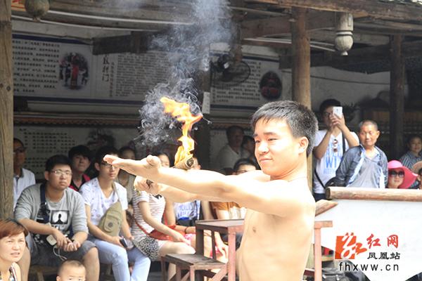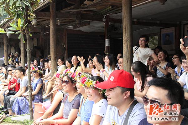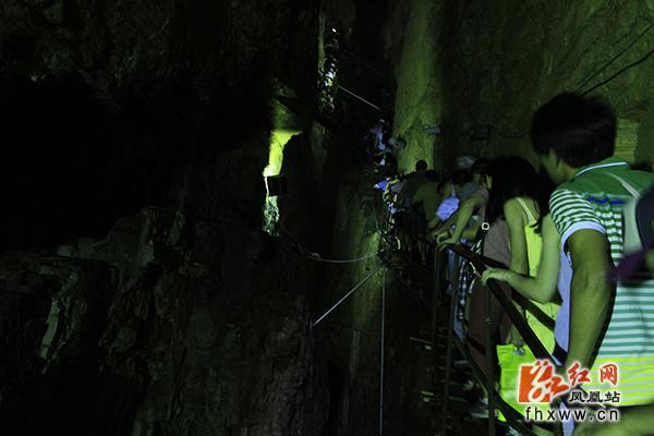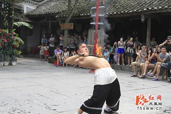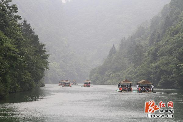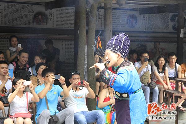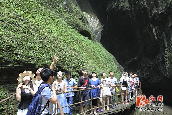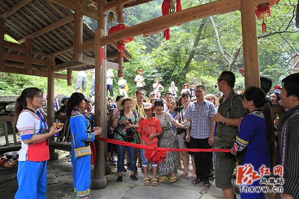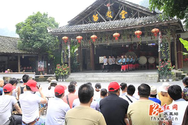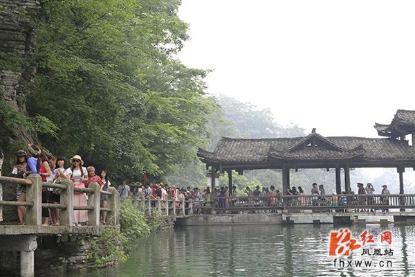 红网凤凰站6月17日讯(分站记者 吴文星) 初夏,凤凰县乡村游又一次迎来客流高峰,景区浓郁的苗族风情喜迎八方游客。在山江苗族生态文化保护区苗人谷景点,游客泛舟平湖,穿越溶洞,作客苗寨,一路欢声笑语;苗族博物馆里,民族风情表演场座无虚席,游客们一边品苗家纯酿米酒,一边看苗族民间技艺表演,有的还与苗家阿哥阿妹唱苗歌跳苗族舞蹈,如痴如醉。