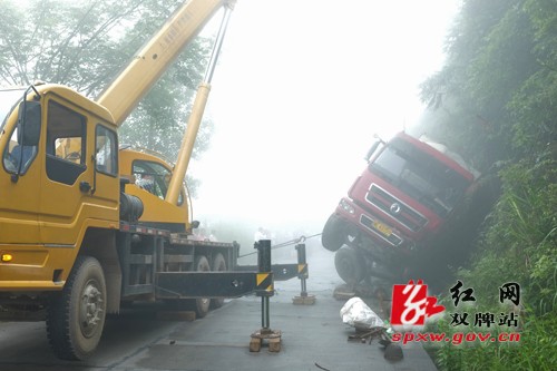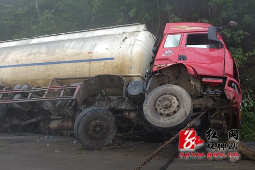 红网双牌站6月18日讯(通讯员 姜丽芳 何恒)6月17日,在双牌县207国道尚仁里段大坪江村境内一辆装满水泥的槽罐车发生侧翻,车辆损坏严重,所幸无人员伤亡。据现场救援人员介绍,因为该路段大山路面比较陡峭,弯路较多,较长时间的行驶导致槽罐车刹车失灵,发生侧翻事故,事故发生时车上有两名司乘人员,所幸伤势较轻,现均已回家休养。