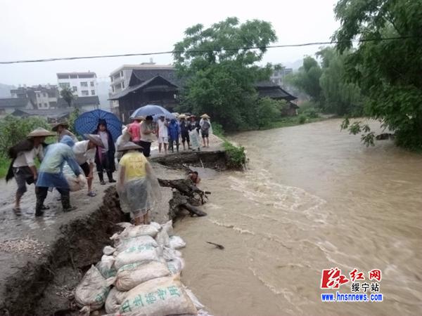 红网绥宁站6月20日讯(分站记者 王伟琪 黄通翔)6月19日至20日,绥宁县瓦屋塘乡普降大到暴雨,累计降雨量达218mm,致使该乡瓦屋等9个村严重受灾。由于洪水冲击,位于该乡瓦屋村的河堤出现近10米的塌方,险情就是命令,灾情就是号角。得知灾情后,以乡党委书记为组长的防汛救灾工作领导小组第一时间赶到现场组织抢险,20多名村民也自发地参与其中,村民贺安东带头跳进湍急的洪水中用沙袋填堤。在现场干部群众的共同努力下,用了近3个小时堵住了河堤的缺口,保护了下游4户房屋及100多亩农田的安全。