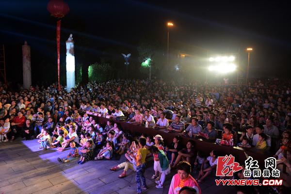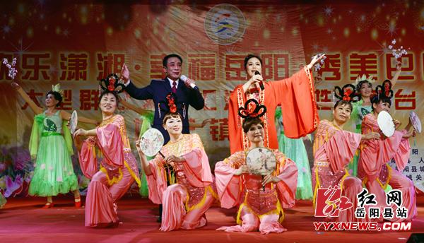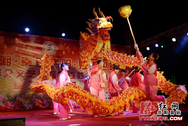 红网岳阳县站6月22日讯(分站记者 许伟军)6月21日晚,湖南省岳阳县厚德广场灯光璀璨,歌舞飞扬,“欢乐潇湘 幸福岳阳 秀美巴陵”大型群众文艺汇演暨百姓大舞台城关镇专场正式拉开帷幕。岳阳县委常委、宣传部长、统战部长喻飞跃,县文广新局、城关镇主要负责人及上千名群众共同欣赏了这场丰盛的文明化餐。在激昂、欢快的锣鼓声中,卫农社区大妈们组成的舞龙队闪亮登场,金黄的中国龙在大妈们的手中自由翻滚,时而盘起,时而俯冲,变化万千,充分展示了龙的精气神韵。随后登台表演的歌舞《舞动春天》、女声独唱《喜气洋洋》、音乐快板《文明花开城关镇》、歌伴舞《中国梦》、花鼓戏《补背褡》、说唱《喜看今日新荣城》等14个形式多样的精彩节目博得现场观众一致好评。