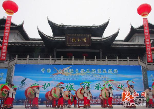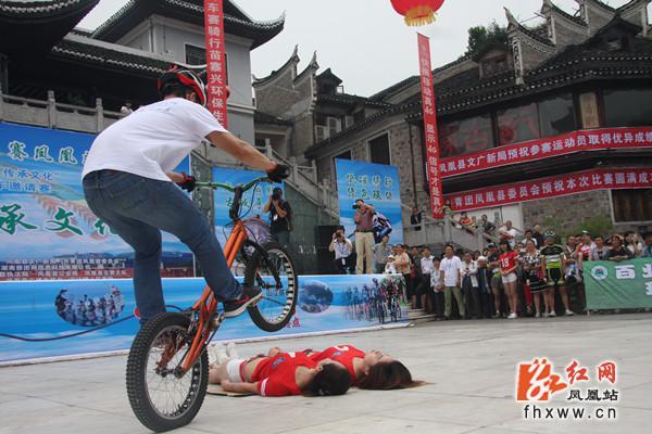 在开幕式现场,越野自行车表演者为大家带来了精彩的特技表演,惊险刺激的表演使得现场掌声欢呼声不断。来自湖北“鹤峰骑游户外”的朱女士高兴地告诉记者:“比赛的名次不是最重要的,能来到凤凰,以自己的行动参与到文化的传承和保护中特别高兴,我们希望能有更多的人加入到传递健康、低碳、绿色正能量的队伍中来。”