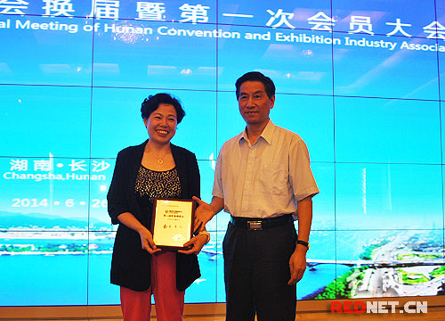 (原湖南省人大常委会副主任蔡力峰[右]为新任会长荣丽萍颁发牌匾。)