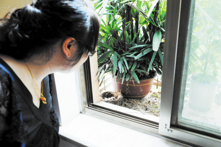 筑在窗台上的鸟巢里,五只小鸟嗷嗷待哺。欧阳天 摄