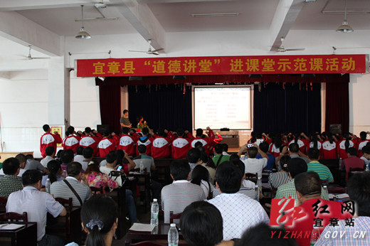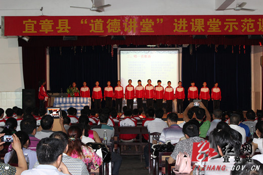 红网宜章站6月27日讯(分站记者 孙林林)6月25日,全县“道德讲堂”进课堂活动在县八中启动。县教育局、全县中小学校等相关单位负责人及八中师生共三百余人参加启动仪式。启动仪式上,县八中徐新辉老师和陈世娇同学共同主持了一堂别开生面的主题班会示范课。班会课围绕“说文明话、行文明事、做文明人”主题开展,共设计了七个环节,即听一首歌,学一个模范,唱一首歌曲,欣赏一段表演,诵读一段经典,做一次反思,表一个决心。该校学生“孝德少年”范林锦作现身说法,他那朴实的话语感动了很多学生。整场班会贴近实际,注重互动,讲座图文并茂,有声有色,让全体师生和参会嘉宾在感同身受中得到潜移默化的教育。