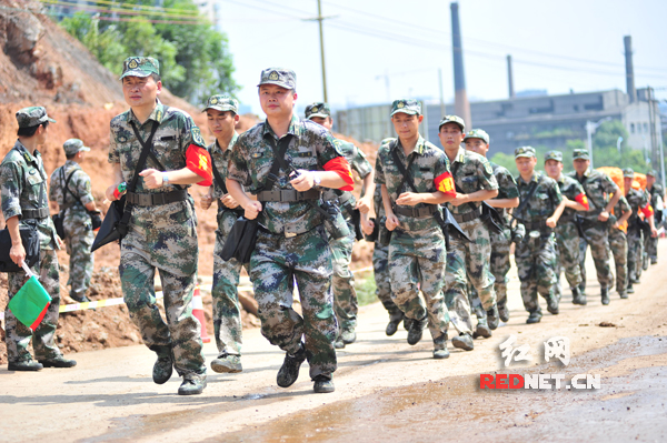 命令下达,演练继续。时值正午,烈日当头,集结场地的地表温度高达50多度。接到机动行军命令,郴州某预备役工兵团应急连迅速集结,经简单动员,官兵们携带生命探测仪、铁锹铁镐、破拆、切割工具等设备,熟练地组织装载。马达轰鸣,清障车、推土机、挖掘机等特种车辆动若风发,向事发地域疾驰电掣。在集结地里,一滩汗水迅速蒸发,只留下一丝丝盐白印记。营长赵军一卡表,机动时间定格在25分钟14秒!