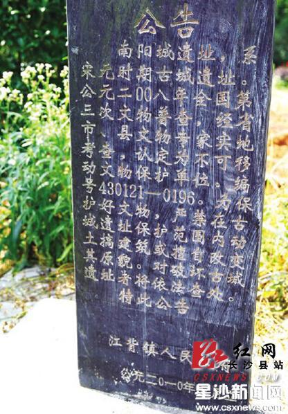2010年,为加强对遗址的保护,江背镇人民政府在遗址上立了一块石碑,其上的保护公告写着“严禁在古城遗址保护范围内动土搞建筑或擅自改变其原貌,对破坏古城遗址者将依法查处。”近日,在长沙市人民政府发文公布的长沙市第六批市级文物保护单位名单中,长沙县新增26家市级文物保护单位,南阳城便是其中一处。