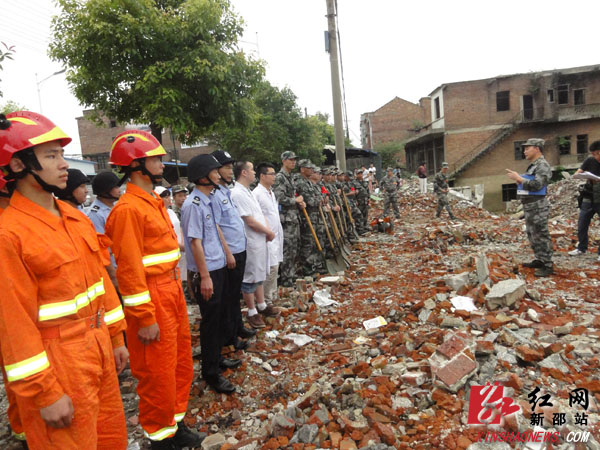 此次演练假设县城酿溪镇新阳社区一民宅发生建筑物坍塌为背景。当天下午2点20分,县应急办来电,新阳社区发生房屋坍塌,造成现场施工人员伤亡。县人武部作战值班员迅速向值班首长报告情况。值班首长要求立即报告部长、政委,建议向酿溪镇和严塘镇民兵应急排下达出动民兵应急救援行动预先号令,并通知人武部干部到作战室参加会议,并拟制下发预先号令。下午2点30分,县人武部在作战室召开紧急会议,县人武部部长黄伟要求立即启动应急机制,并对救援提出具体要求,县人武部政委李志林也对救援工作作了强调。