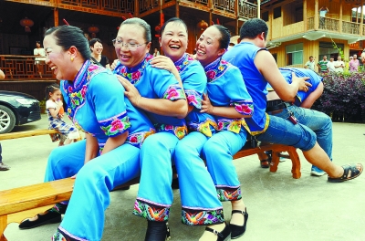 7月3日,城步苗族自治县丹口镇桃林苗寨,村民在为游客表演“挤油尖”。“挤油尖”是该县苗族群众中特有的一项比智慧、赛力气、增友谊的游戏活动:青年男女双方为一条长约3米、宽40厘米的木板凳“占有权”进行激烈“争夺战”。